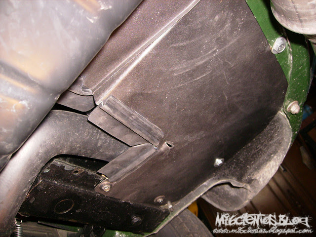 Como había quitado la chapa que envuelve el cárter para poder montar el escape he aprovechado para medir, cortar y poner la goma ya modificada. Lo primero ha sido cortar la parte de la chapa por donde pasa el tirante: